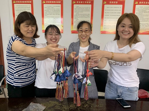 在传统习俗中,玲珑可爱的各色香包也是端午节必不可少的元素。包完粽子后大家转移阵地到了活动室,大家围坐桌边,面前堆放着一份份材料包,有棉布、艾草、针线、中国结流苏。面对这个从来没有做过的DIY,大家开始研究起来,有的用手机搜索缝制方法流程,有的直接比来比去亲自摸索着缝起来。有职工说:“这有点像咱们小时候老人们缝的毽子,那个里面装的是五谷杂粮,咱们现在装的是艾草。”“这香囊可以挂在办公室或者车上,有清香、驱蚊的功效。”“我算是知道了,这个流苏应该缝在这个边的中间,而不是角上……”大家你一句我一句,手中的针线穿梭在棉布间,用密密的针脚缝制出传统佳节最好的注解,用丝丝线线缠绕出端午安康的美满寓意,一个个精巧可爱的三角香囊在大家的努力下完美呈现。