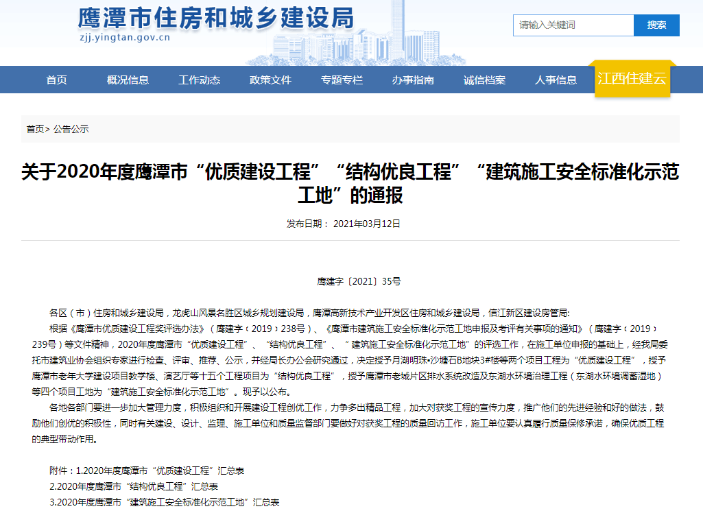 4月12日,从江西省鹰潭市住房和城乡建设局网站获悉,四分公司承建的鹰潭市档案中心项目喜获2020年度鹰潭市结构优良工程和建筑施工安全标准化示范工地两项荣誉。