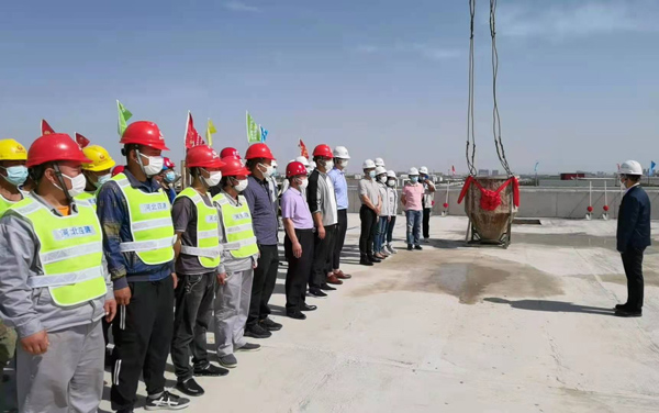 随着建设方代表韦汉英总经理发出“封顶仪式启动”的指令,塔吊启动、泵车轰鸣,正天车间大楼封顶仪式正式开始,扎着红色彩球的混凝土泵送车挥动大臂从地面将混凝土泵送至楼上30米高处的布料斗,塔吊臂跑车滑动,承载着绣带飘扬的料斗平稳的将混凝土运送至浇筑点,三方人员拿起铁锹,挥臂铲砼,完成了最后一立方混凝土的浇筑,共同见证了大楼主体的圆满封顶。